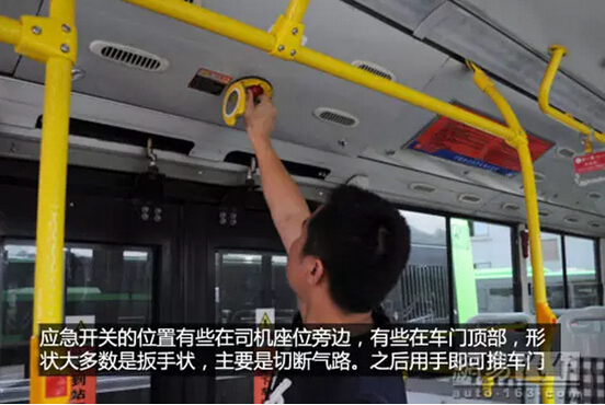 目前大客車一般都配有應急開關。根據(jù)不同的車型,應急開關的位置也不一樣。有些在司機座位旁邊,有些在車門頂部,形狀大多數(shù)是扳手狀,就像電扇的檔位開關。這個開關主要是切斷氣路。而打開的方式也各不相同,有旋轉(zhuǎn)的、拉出的,然后用手推車門,車門就能打開。具體操作一般在應急開關旁都有說明,乘客也可聽從司機安排,沉著處置。