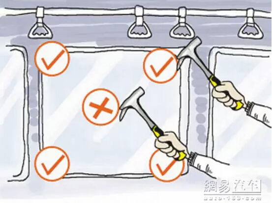 如果車門因電路失靈無法打開的,可用安全錘擊碎車窗玻璃。如果可以的話,乘客應抓住空當,用一個塑料袋包裹住頭部,讓塑料袋內(nèi)的空氣暫時供氧。