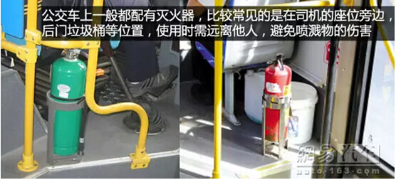 大客車上一般都配有滅火器,比較常見的是在司機的座位旁邊,也有的在后門垃圾桶的位置。如果遇到火災,會使用滅火器的可以幫助司機一起滅火。需要注意的事,在使用滅火器時,周圍人員應盡量遠離,因為噴濺物也容易傷到人。