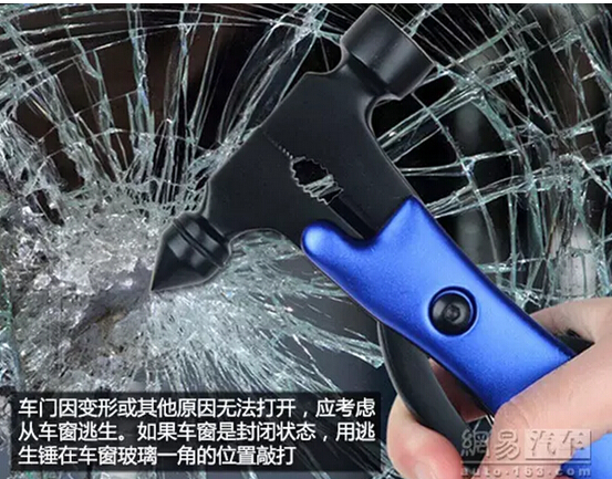 車輛落入淺水后,由于自重的影響,車頭會前傾,而且水面下的情況不穩(wěn)定,建議乘客在車輛停穩(wěn)后再采取行動,同樣可利用安全錘,或其他尖銳物品敲擊玻璃的四個角,可迅速擊碎車窗玻璃逃生。