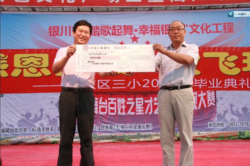 在捐資儀式上,當(dāng)寧夏路橋公司董事侯立和公司工會主席蔡許川把一張印有“50萬元”的巨幅“銀行支票”交付給學(xué)校校長時,舞臺下的師生和觀眾雷聲般的掌聲久久回蕩在廣場上空。