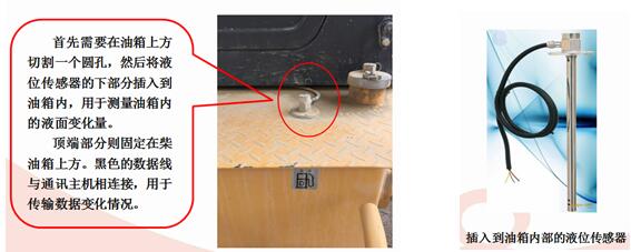 智能油耗儀即安裝在機械設備上的終端設備,由液位傳感器、通訊主機組成。液位傳感器安裝在車輛或工程機械的柴油箱上方,油桿部分插入到油箱內部用于測量油箱內液面的高度變化。