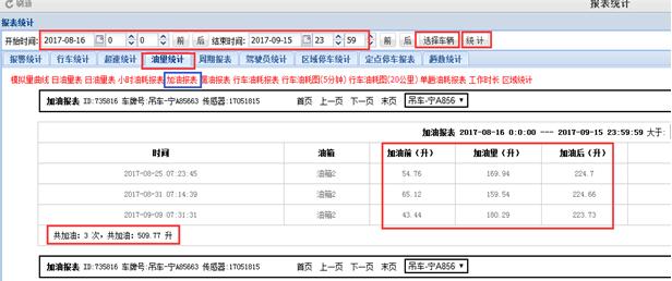 (三)可以生成各類報表,查詢和統計機械設備發(fā)動機工作時間、加油量、燃油消耗、行駛里程等各類數據。例如: