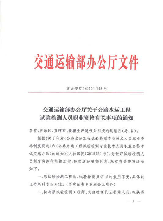 交通運(yùn)輸部辦公廳關(guān)于公路水運(yùn)工程試驗(yàn)檢測人員職業(yè)資格有關(guān)事項(xiàng)的通知