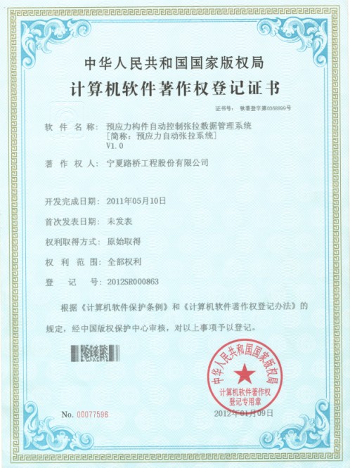 預(yù)應(yīng)力構(gòu)件自動(dòng)控制張拉數(shù)據(jù)管理系統(tǒng) 軟件著作權(quán)登記證書(shū)