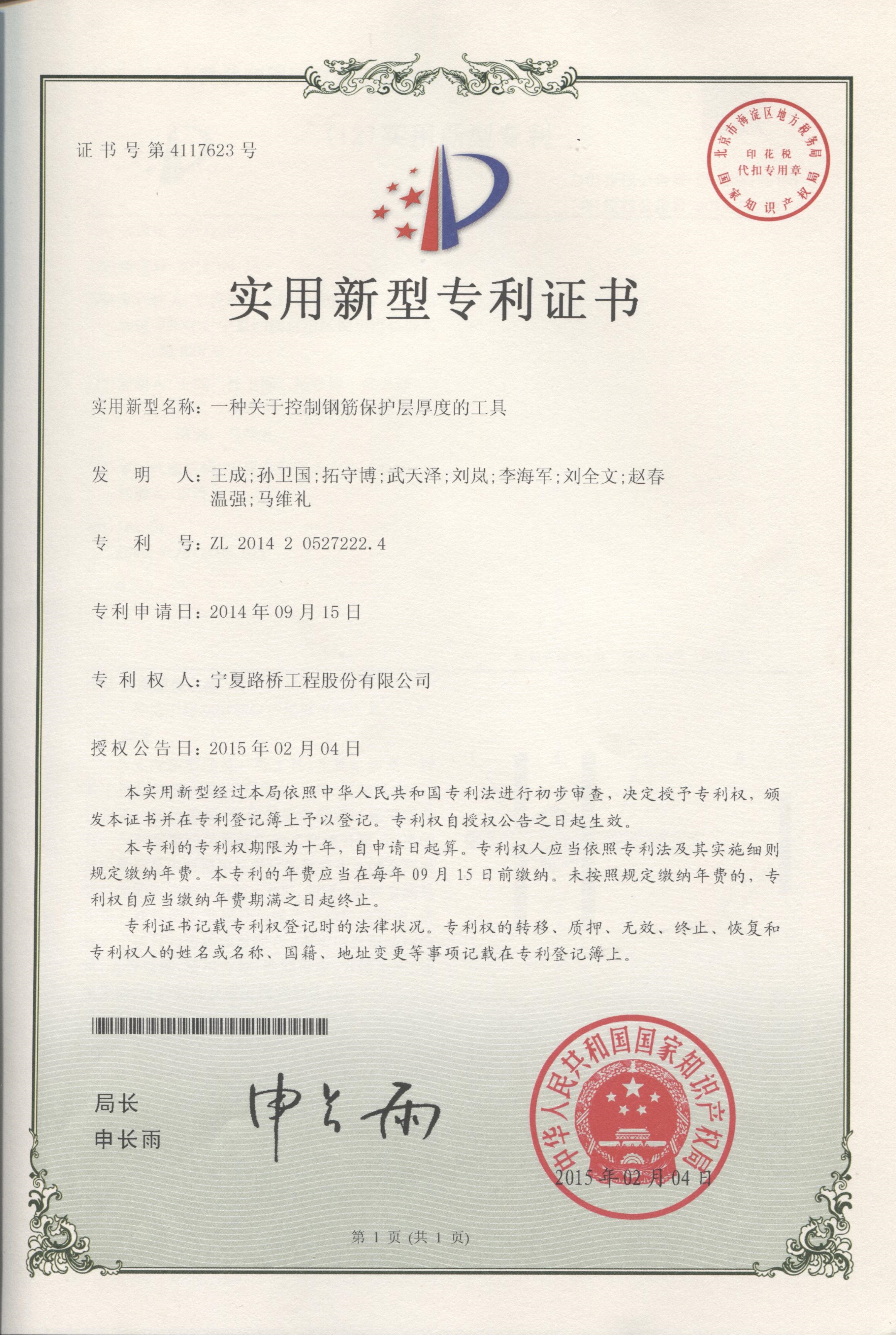 實用新型專利證書:一種關(guān)于控制鋼筋保護層厚度的工具