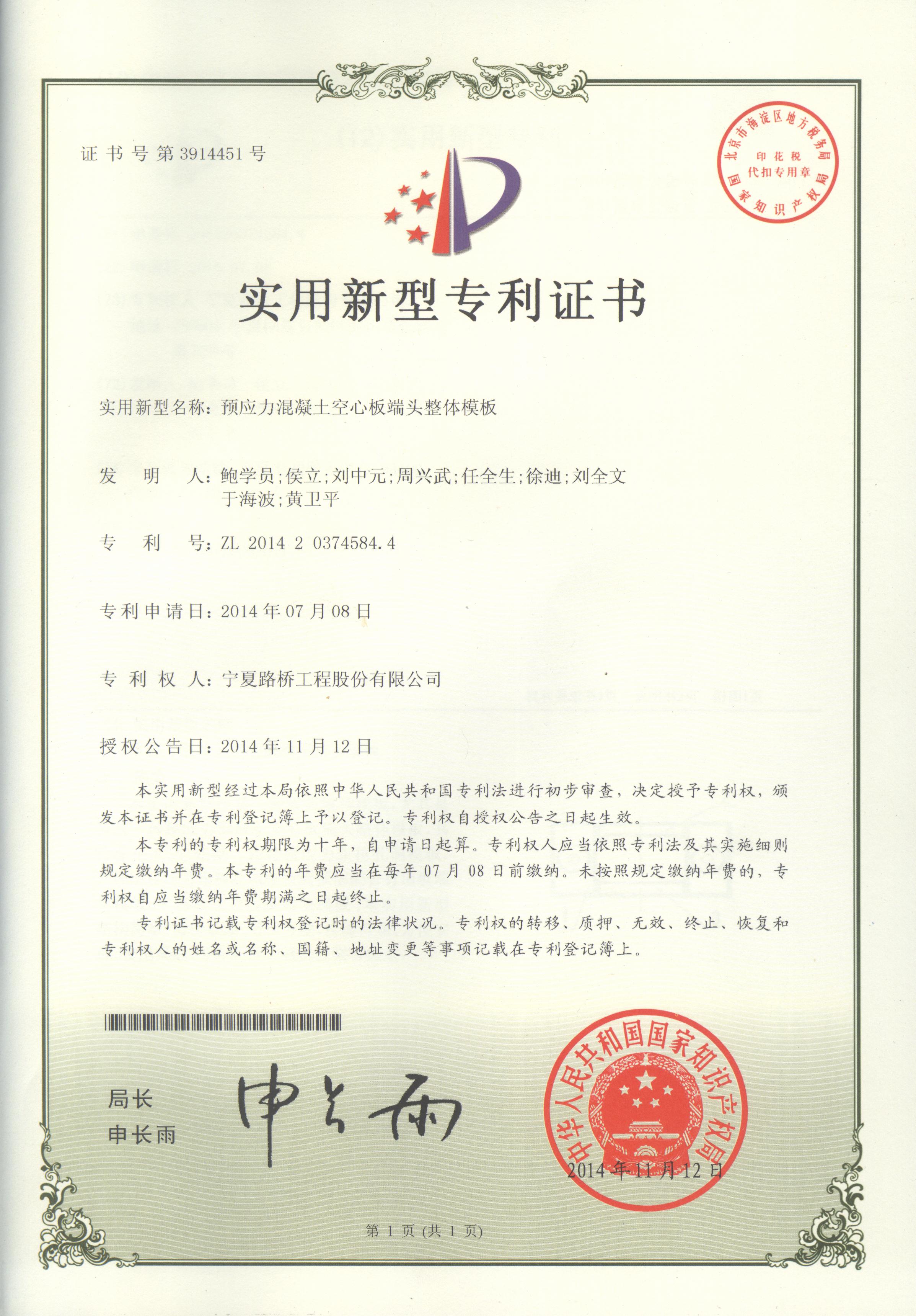 實(shí)用新型專(zhuān)利證書(shū):橋梁預(yù)