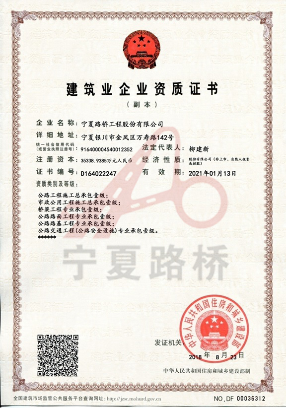 建筑業(yè)企業(yè)資質(zhì)證書:寧夏路橋工程股份有限公司