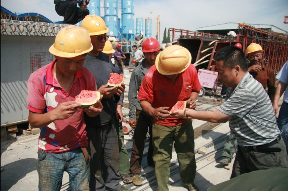 日前,寧夏路橋公司董事侯立、黨委副書記、紀(jì)委書記楊學(xué)祿和工會主席蔡許川帶著菊花茶、礦泉水、西瓜、汗巾等防暑用品到省道304線鹽池至紅井段公路工程第一項目部為施工一線的員工和農(nóng)民工送清涼。至此,奮戰(zhàn)在公路建設(shè)第一線的600名員工和農(nóng)民工已經(jīng)感受到了“暑夏清涼”。