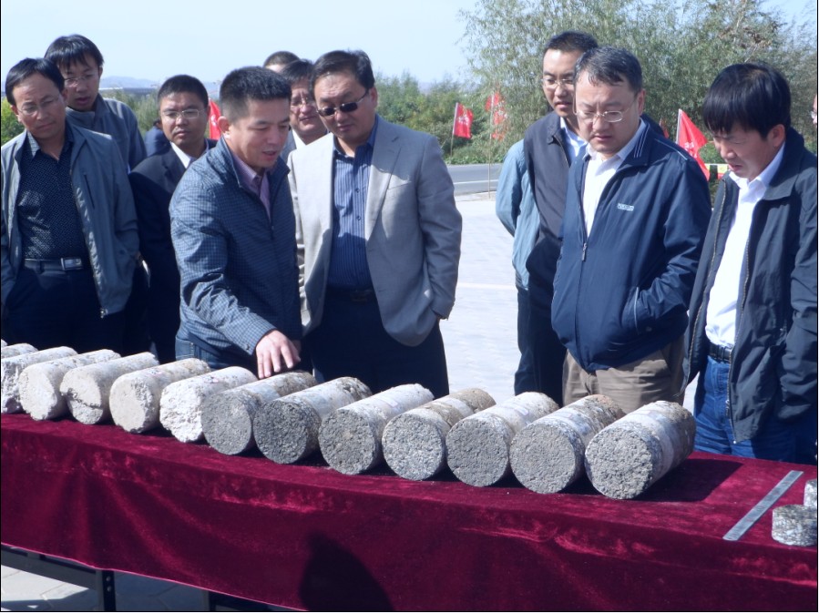 調(diào)查組一行查看現(xiàn)場(chǎng)后,聽(tīng)取了交通公司金成代表公司做的基層冷再生施工技術(shù)的情況簡(jiǎn)介,并查看了基層芯樣。