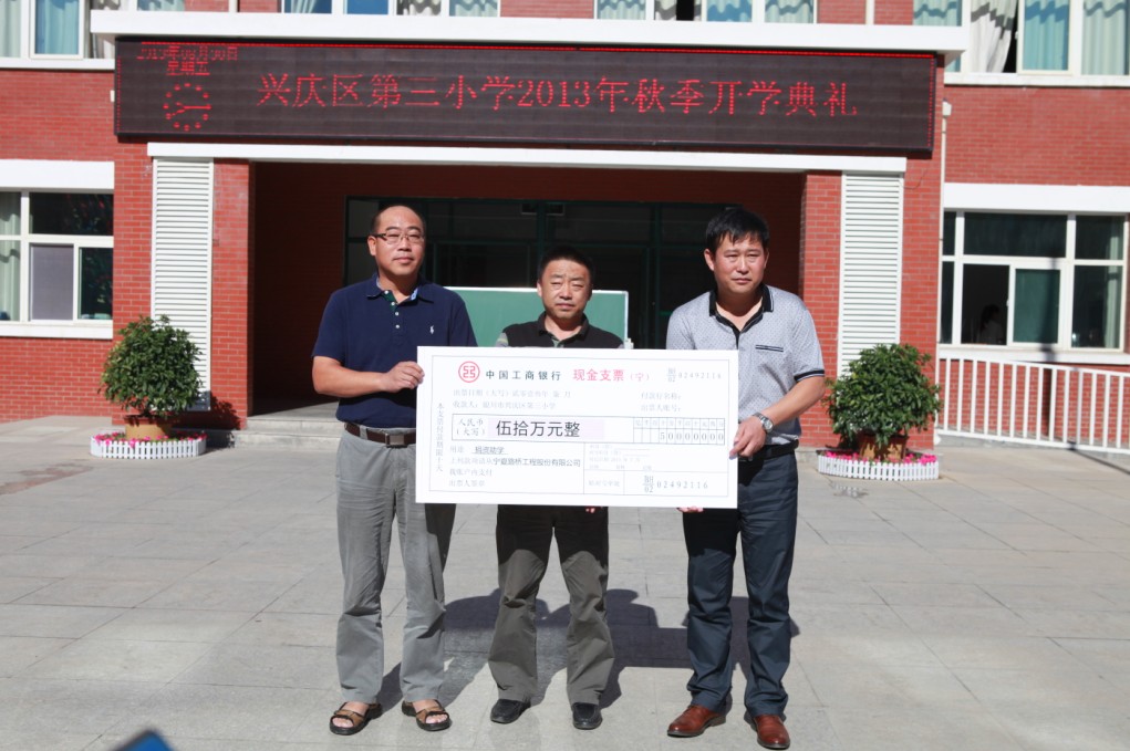 2013年8月30日,是孩子們新學(xué)期的開始。寧夏路橋公司在企業(yè)穩(wěn)步發(fā)展的同時(shí)不忘社會(huì)責(zé)任、反哺教育事業(yè)。在興慶區(qū)第三小學(xué)迎來(lái)了建校100周年之際,寧夏路橋公司第四次為該校捐資助學(xué)50萬(wàn)元。捐助款項(xiàng)用于改善學(xué)校硬件設(shè)施,為孩子們創(chuàng)造更好的學(xué)習(xí)環(huán)境。寧夏路橋公司董事侯立、工會(huì)主席蔡許川出席了捐款儀式。