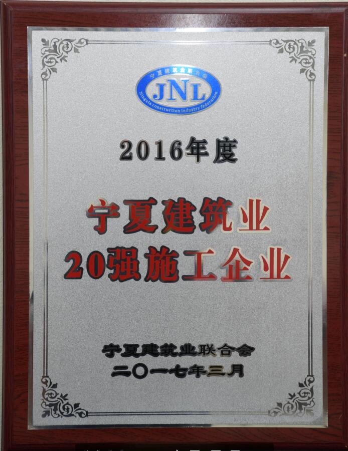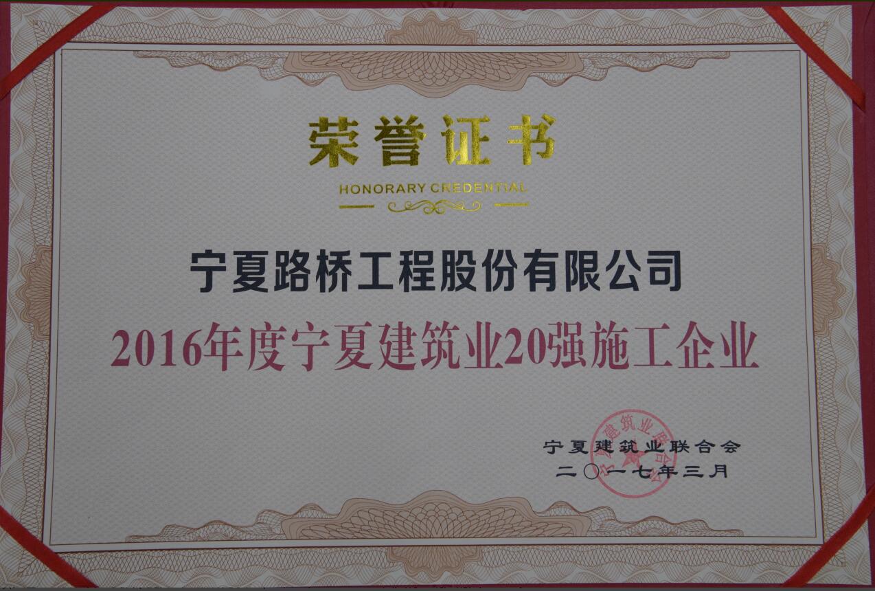 | 寧夏路橋獲評(píng)2016年度寧夏建筑業(yè)20強(qiáng)和全區(qū)建筑業(yè)先進(jìn)企業(yè) |