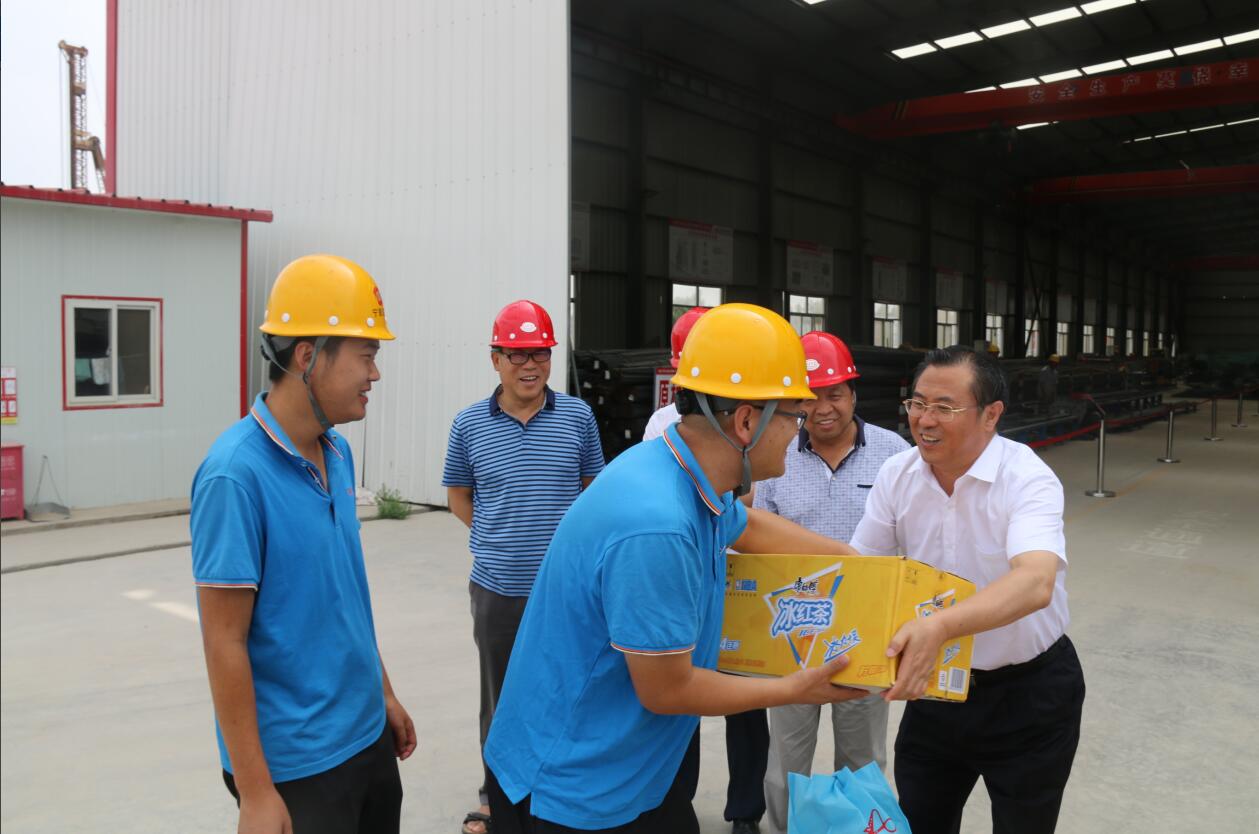 又是一年盛夏時(shí)節(jié),驕陽(yáng)似火炙烤著大地,寧夏連續(xù)高溫,暑熱難耐,為了表達(dá)對(duì)一線職工的敬意和關(guān)愛,7月20日上午,交通運(yùn)輸廳黨委委員、副廳長(zhǎng)劉鵬云帶領(lǐng)廳組織人事與老干部處及寧夏交通工會(huì)負(fù)責(zé)人等一行,來(lái)到石嘴山紅崖子黃河公路大橋施工現(xiàn)場(chǎng),為奮戰(zhàn)在一線的工程建設(shè)者送來(lái)解暑涼茶、礦泉水、綠茶、冰糖等慰問(wèn)品,并對(duì)他們頂著酷暑還依然堅(jiān)持在一線施工的精神致以誠(chéng)摯的問(wèn)候。