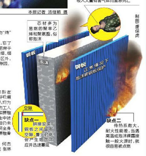 “活動(dòng)板房很容易著火,一旦起火,蔓延很快。”從事建筑行業(yè)十多年的趙先生說(shuō),目前工地使用的活動(dòng)板房多為彩鋼活動(dòng)板房,一般由彩鋼夾心板搭建而成,芯材多為易燃的聚苯乙烯和聚氨酯,也就是俗稱(chēng)的泡沫。