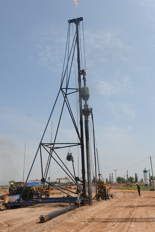 圖為工人們在濕陷性黃土路段進(jìn)行打樁作業(yè)