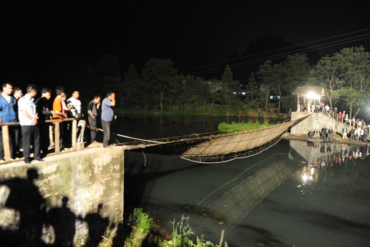 據(jù)了解,1日晚9:10分左右,鳳凰縣桃花島篝火晚會跨河吊橋因受力橋墩斷裂,出現(xiàn)橋面傾斜,從篝火晚會散場的游客經(jīng)過吊橋時落水。