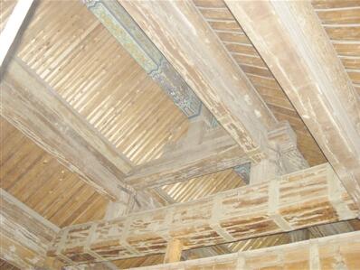 柱頂之上為斗拱。斗拱由坐、拱、翹、升等小尺寸構(gòu)架由下至上層層疊加而成。地震作用下,這些細(xì)小構(gòu)件之間相互擠壓、錯(cuò)動(dòng),可耗散大量地震能量,并能夠延長(zhǎng)建筑的晃動(dòng)周期,產(chǎn)生隔震效果。地震結(jié)束后,這些小構(gòu)件基本能恢復(fù)到初始位置,并保持完好。此外,厚重的屋頂猶如一個(gè)胖子,在外力作用下晃晃悠悠的往復(fù)搖擺,但始終保持穩(wěn)定不倒,起到了很好的隔震效果。